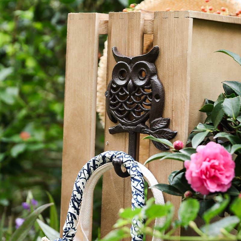 This decorative owl-shaped hook is made of durable cast iron, featuring an intricate openwork design. The rustic brown finish adds a vintage charm, making it a perfect addition to any garden, entryway, or indoor space. It is designed for wall mounting and can be used for hanging keys, accessories, or lightweight items. Ideal for nature lovers and those who appreciate farmhouse or cottage-style décor.(screws are included)