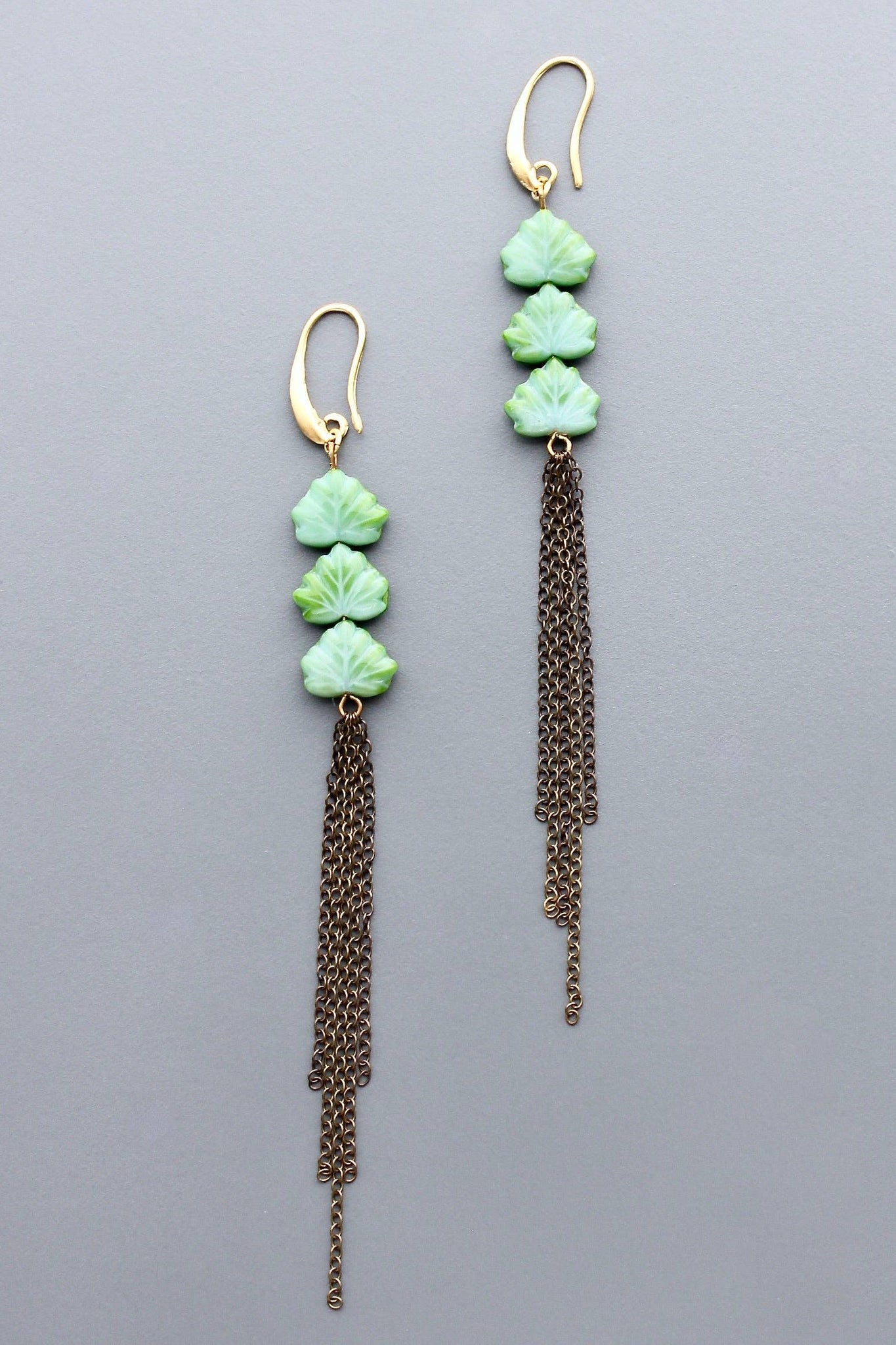 18k gold plated brass hooks with glass czech leaves and oxidized brass chain. Each half pair weighs .14 oz and measures 5.25 inches